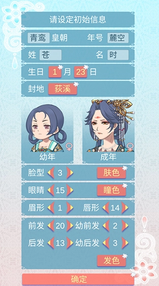 在游戏初始界面,选择并设置好人物的各项属性,以及姓名、年号等相关数据。