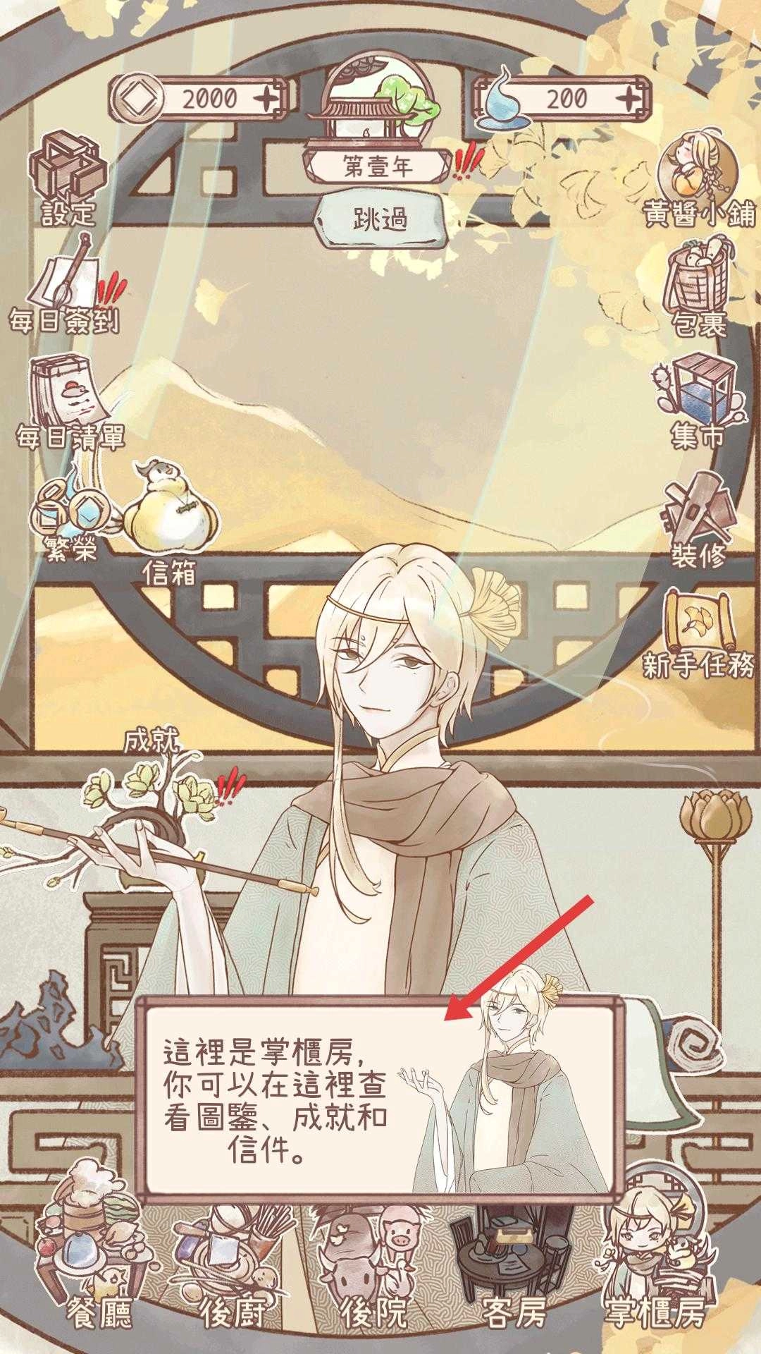 进入掌柜房,可查看图鉴、成就与信件,借此了解游戏内容与进度,获取相关信息以推进游戏进程。