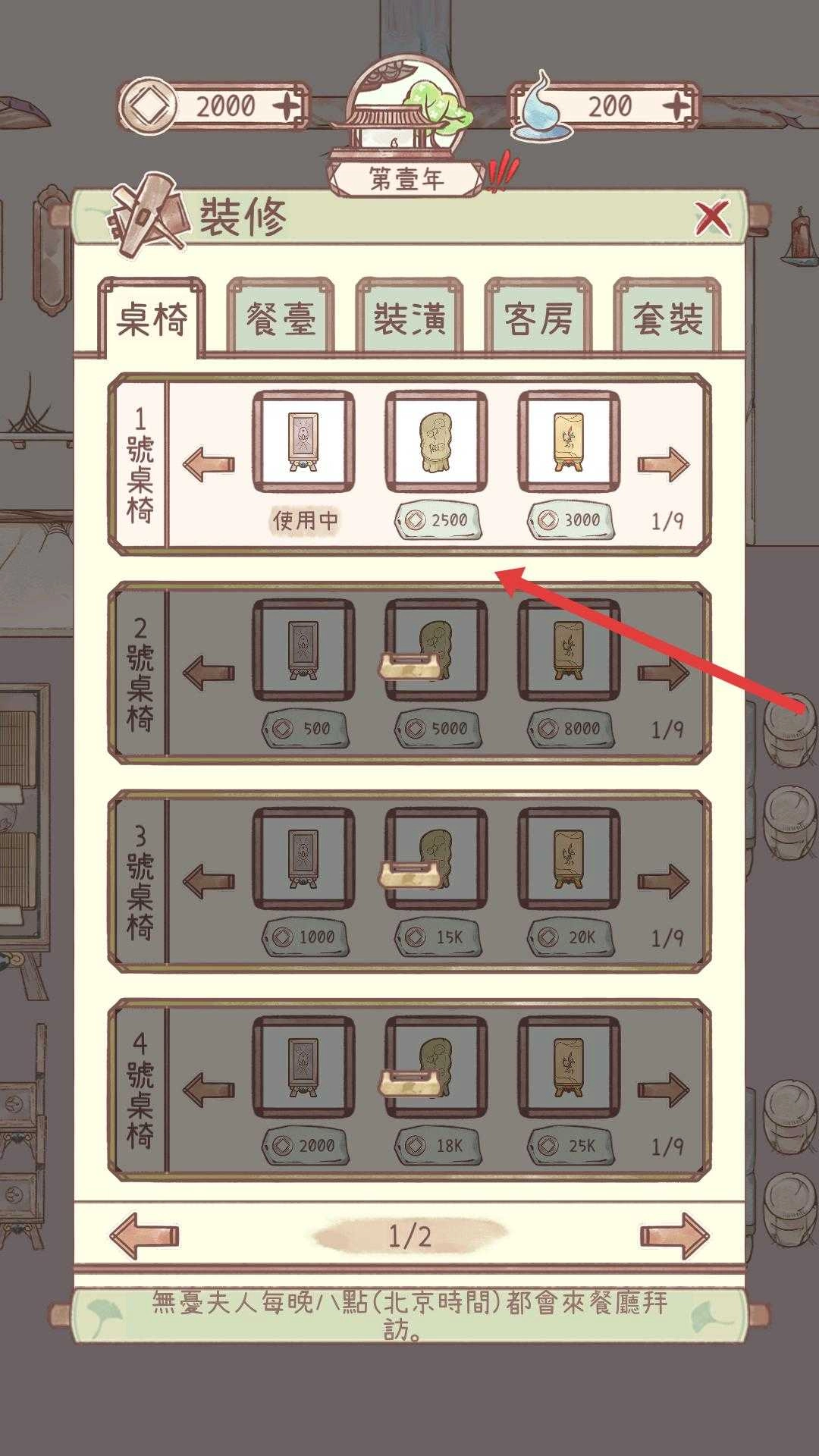 进入装修界面后,挑选桌椅、餐台这类装修品类,完成装修物品的购置与更换,以此增强场景的美观程度和实用功能。