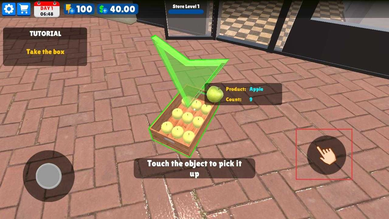 在户外场景中,你会看到装有苹果的箱子,按照提示触摸箱子,就能拿起箱子里的苹果,为后续的摆货工作做好准备。