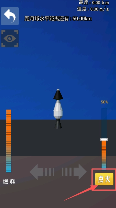 在火箭发射的界面中,留意右上角显示的高度与速度数据,随后点击右下角的黄色点火按钮,以此启动火箭。