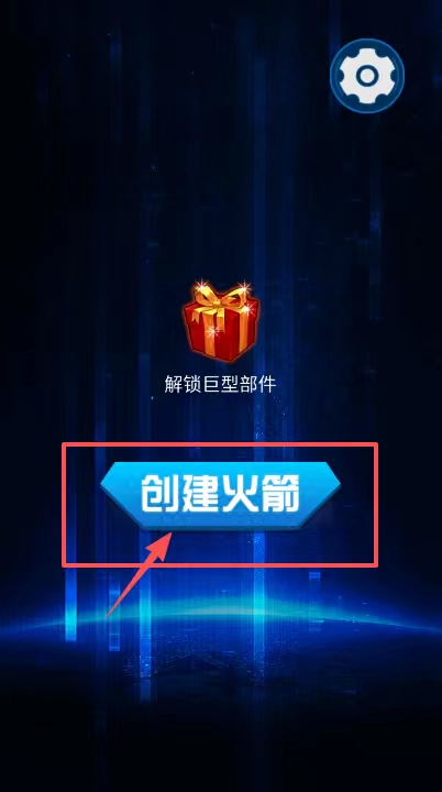 在深蓝色的科技风格界面上,点击那个被橙色箭头指向的“创建火箭”按钮后,就能看到关于解锁巨型部件的提示信息。