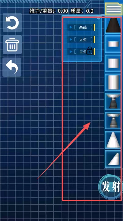 在蓝色网格界面中,点击右上角的部件选项,然后选择底部的发射按钮,操作时请注意查看推力和质量的数值。