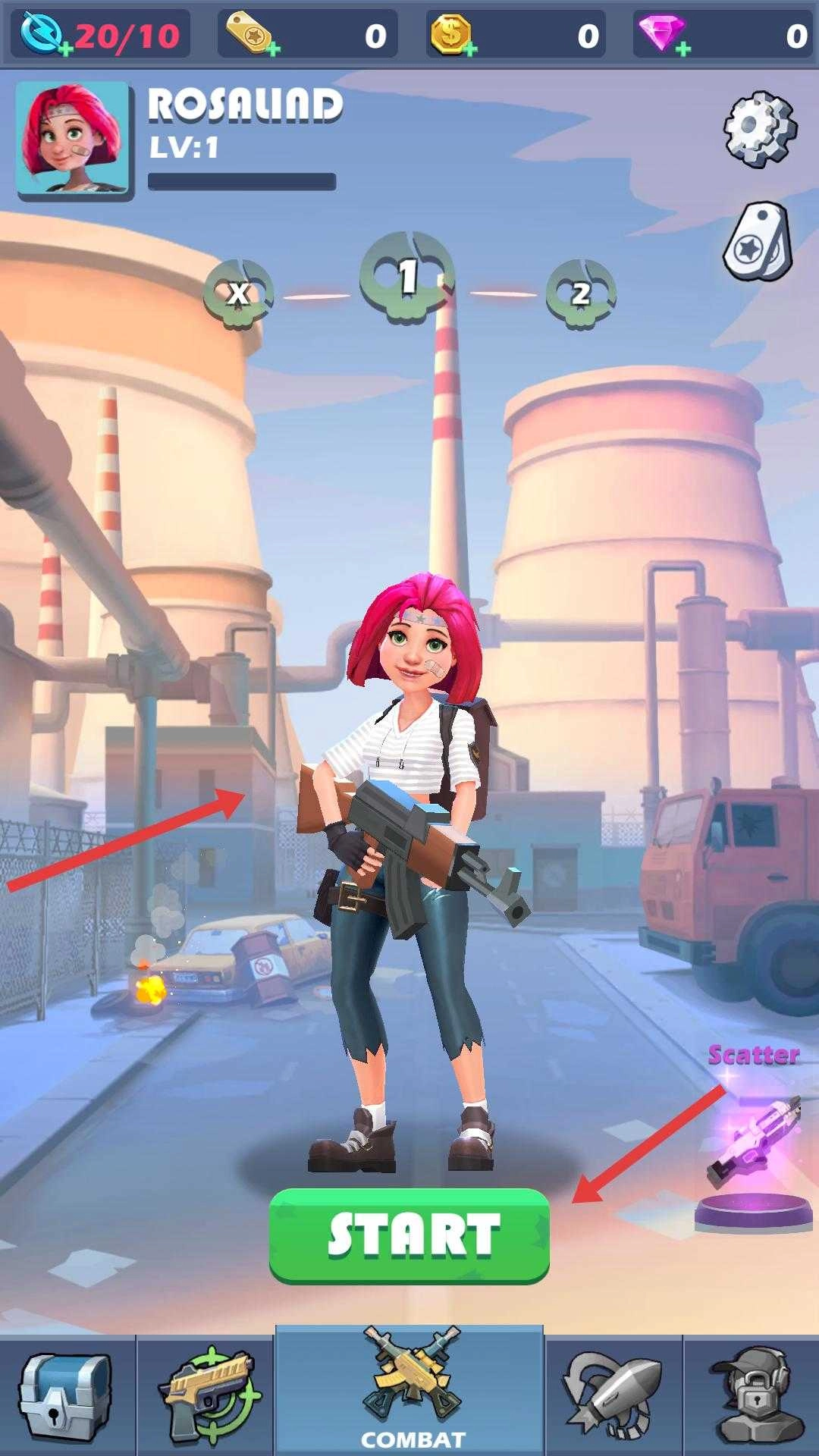 进入游戏后,你会看到包含角色、武器等元素的界面,界面上设有START按钮,点击该按钮即可开启僵尸射击挑战之旅。