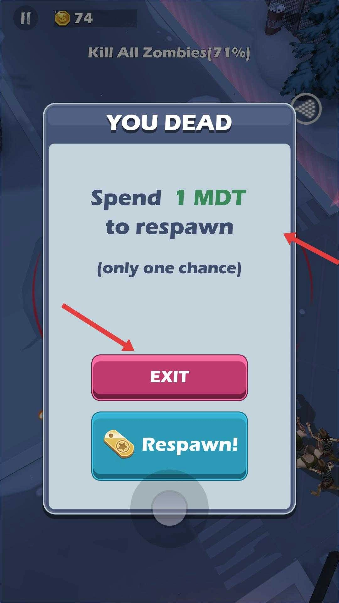 在射击过程中,若角色不幸死亡,屏幕上会弹出显示“YOU DEAD”字样的界面,该界面设有相应按钮,玩家可通过点击按钮选择退出游戏或复活角色继续游玩。