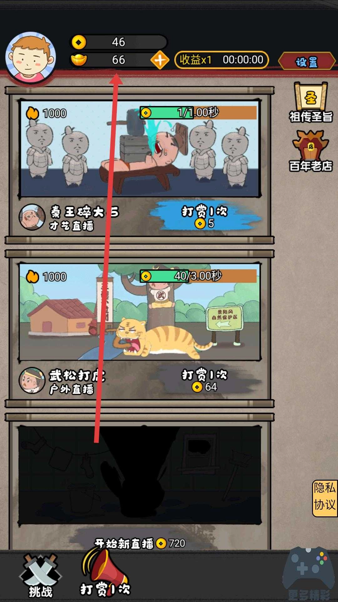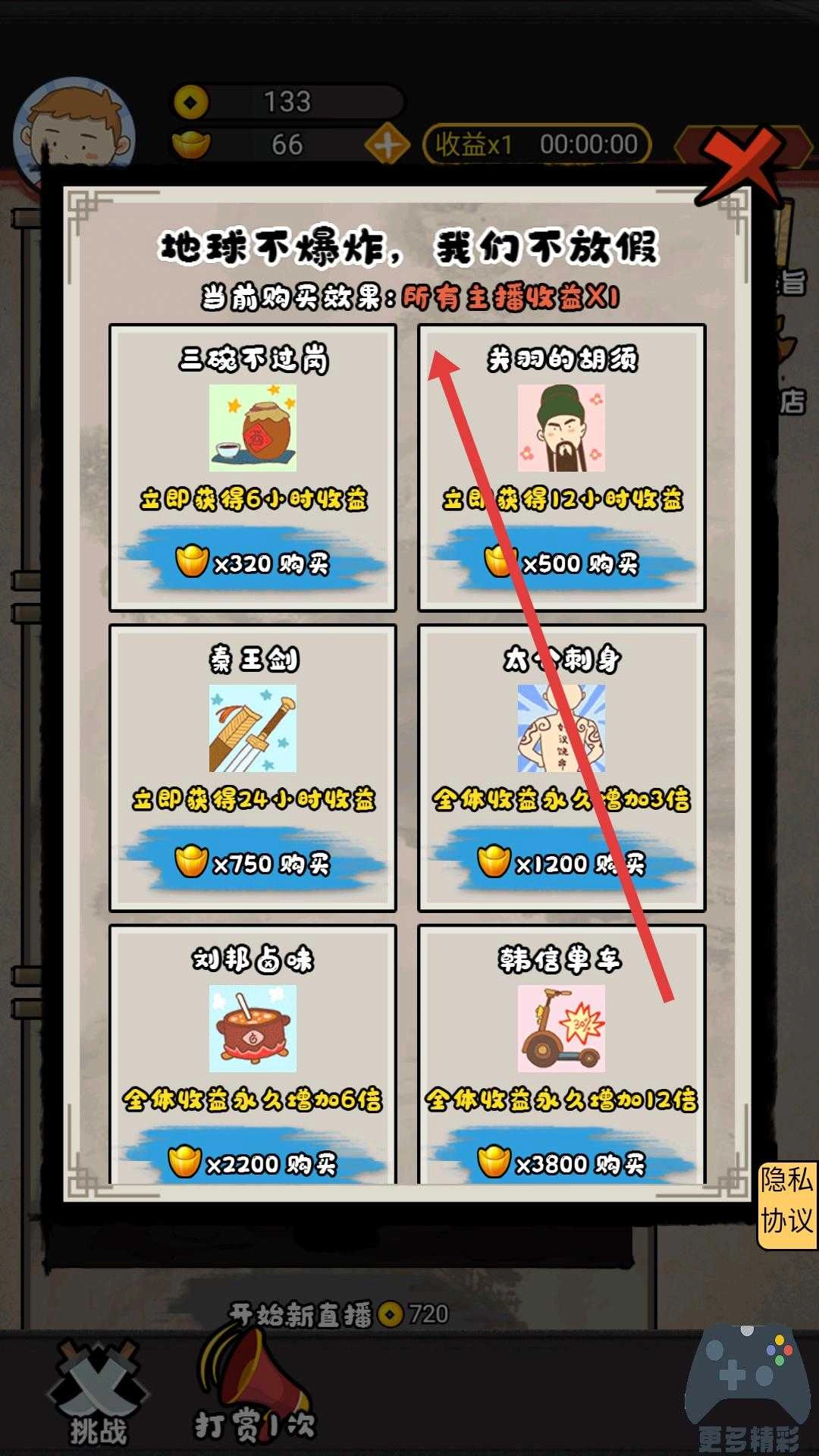 购买道具后返回主界面,直播收益会有所提高,接着观看直播,积累更多的金币和元宝,就能解锁新的直播内容。
