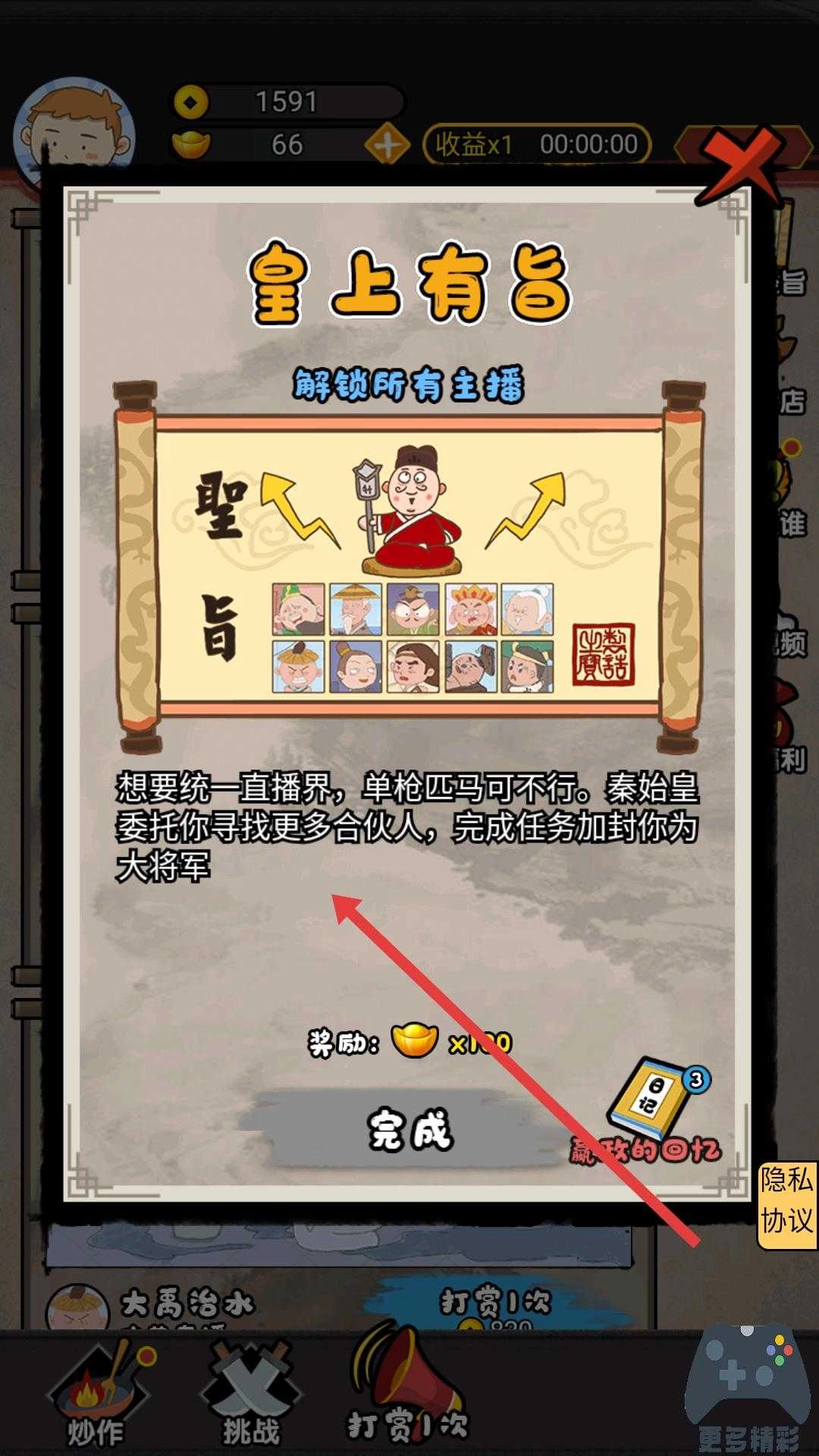 当满足相应条件时,会弹出“皇上有旨”的任务提示。此时需要解锁全部主播,待任务完成后点击“完成”按钮,即可领取元宝奖励,以此推进游戏进程。