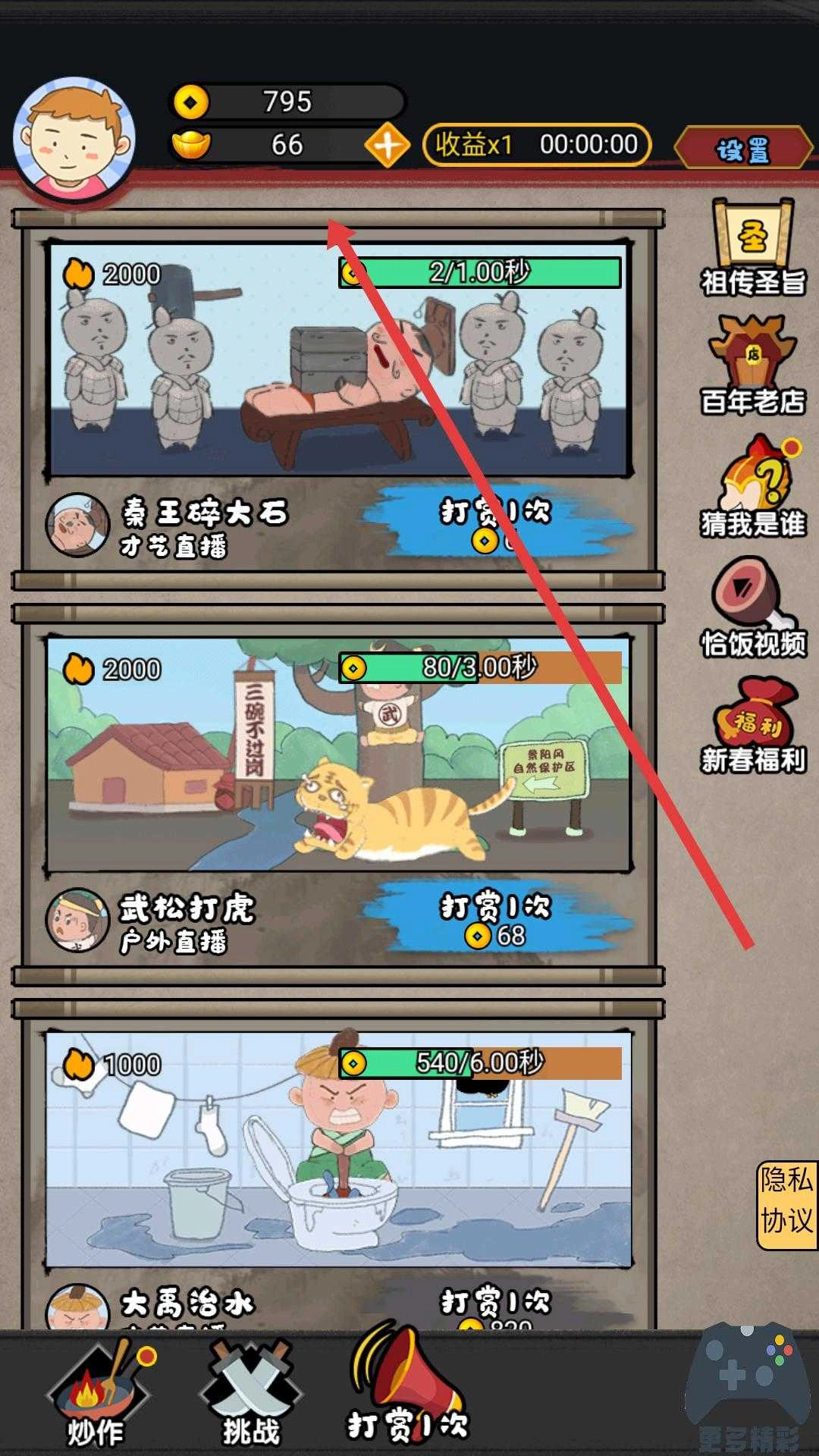 打开游戏后进入主界面,就能看到秦王碎大石、武松打虎等各类直播内容,观看这些直播还能获取收益。