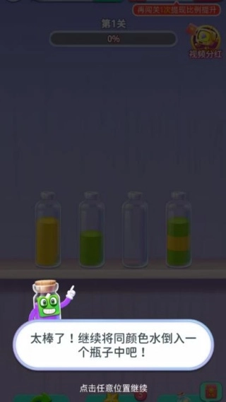你需要通过点击源瓶和目标瓶来实现液体的转移操作,每次倾倒时只能处理同一种颜色的液体,并且这个过程会持续到目标瓶被倒满或者源瓶里的液体被全部清空为止。你的最终目标是让所有瓶子里的液体都呈现出单一颜色的状态。