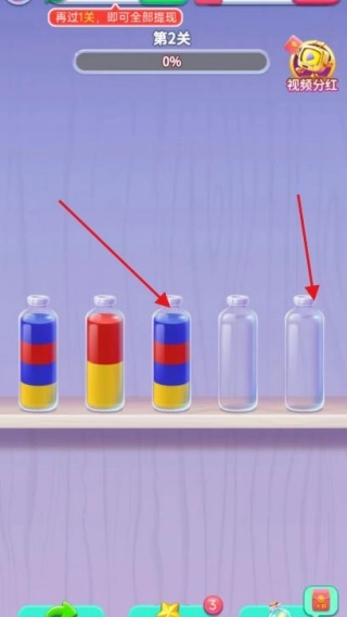 通过分层倾倒的方式让分散的同色液体逐步聚集,等所有颜色都被分离到独立容器后,系统就会触发通关动画和星级评分。