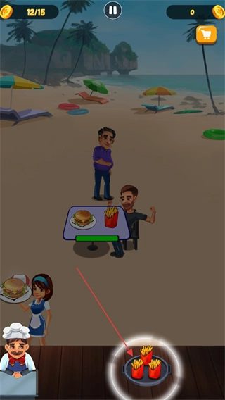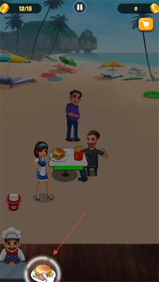 进入游戏后,注意观察左上角显示的金币数量12/15,接着点击厨师旁边的食物图标,比如汉堡。
