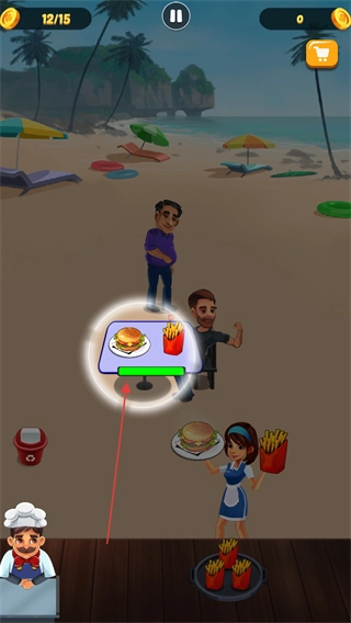 通过操控服务员把食物送到顾客桌上,满足顾客的需求来获取金币,比如金币数量会显示为36/15这样的形式。