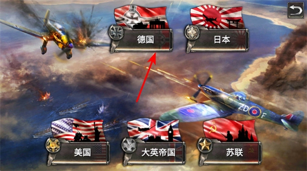 启动游戏流程,点击开始游戏按钮,进入游戏的阵营选择界面,开启二战飞机缠斗的冒险旅程。