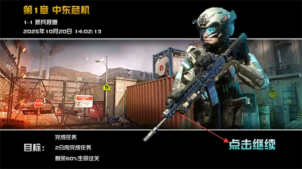 在关卡选择界面,比如第1章中东危机里的1-1新兵报道这一关卡,先确认好关卡目标和对应的奖励,然后点击出战按钮即可。