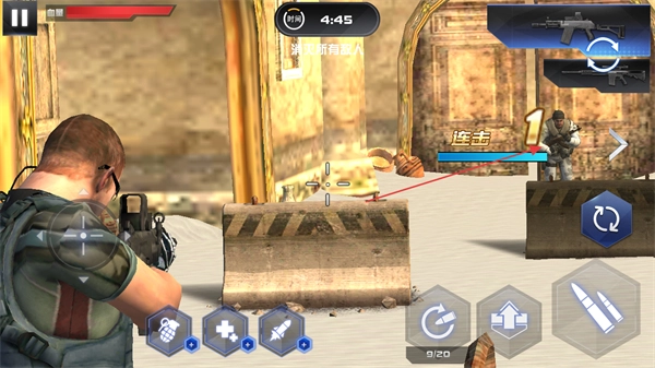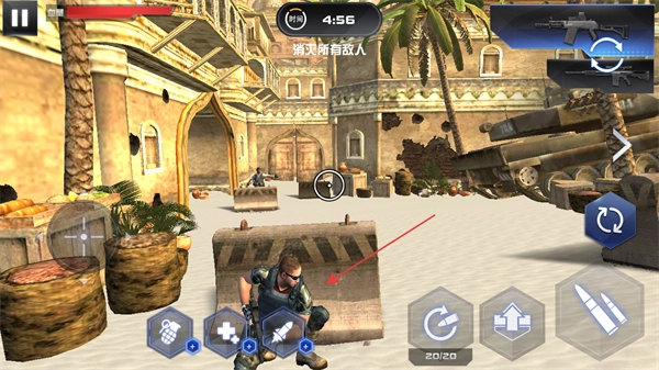 当发现敌人时,可借助屏幕右侧的射击按钮发起攻击,同时结合手雷、火箭筒等道具来歼灭敌人,从而达成关卡设定的目标。