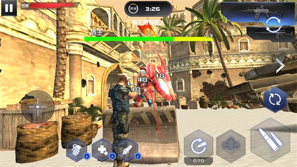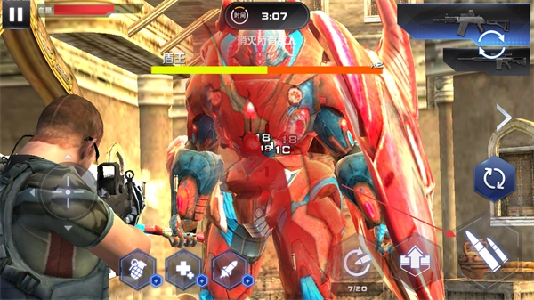 进入战斗状态后,一旦遭遇像红色机甲怪物这类敌人,就借助左下方的虚拟摇杆来操控角色移动,同时利用掩体来规避敌人的攻击。