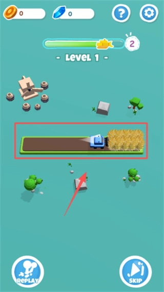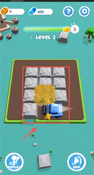 在关卡进行过程中,你可以点击左下角的蓝色REPLAY重玩按钮来重置当前进度,也能通过右下角的红色SKIP按钮直接跳过本关;另外需要特别留意,完成收割蓝色卡车周边麦田这一核心任务是关键。