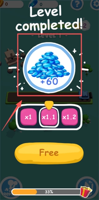 结算界面会弹出黄色的Free免费奖励框,里面有x1、x1.1、x1.2三种倍率可供选择,选好确认后就能拿到相应数量的宝石奖励(比如+60宝石)。