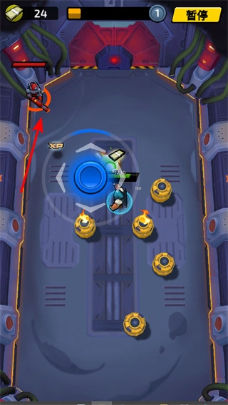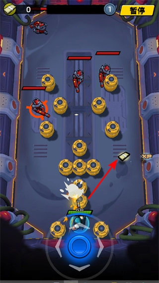 在满是黄色装置的场景里,攻击敌人时要留意带有XP标识的经验道具,收集它们能让角色成长得更快,从而帮助你顺利通关。