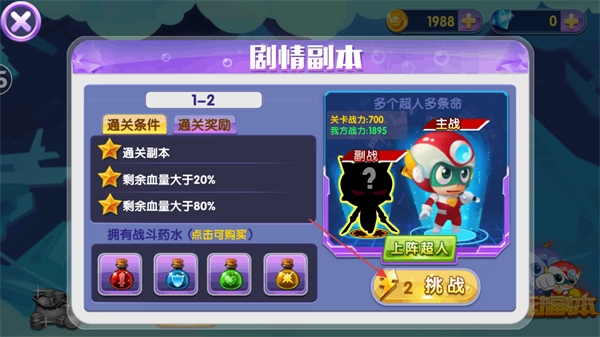 在剧情副本界面,选择1-2关卡,查看通关条件和通关奖励,然后点击上阵超人,再点击挑战。