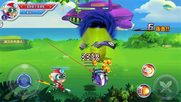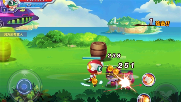 进入战斗后,使用左下方的虚拟摇杆来操控开心超人移动,点击攻击按钮击败怪物以积累连击数。