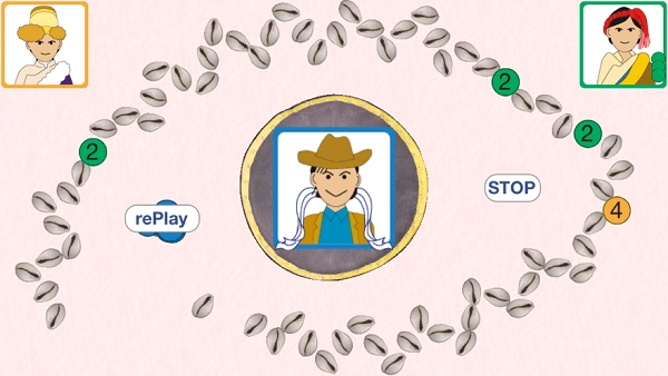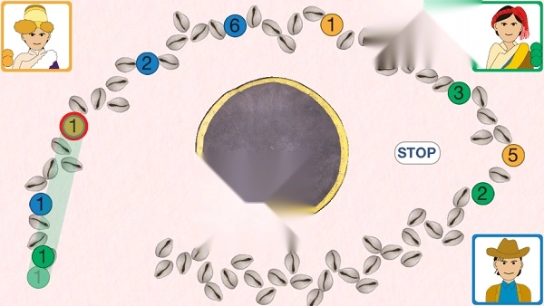 把所有贝壳按顺时针方向从外往内摆成漩涡的形状。每个贝壳之间留出一点空隙当作棋位,这样总共有六十五个棋位。把最外层贝壳的侧边作为起点,最内层贝壳的侧边作为终点。在正中心放置骰碗和骰盘。