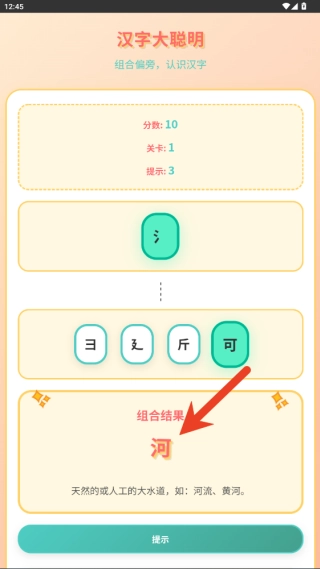 当玩家觉得自己已把偏旁部首正确拼合成目标汉字时,点击提交按钮,系统就会马上做出判断,要是组合正确就能通关,还会有积极的反馈。