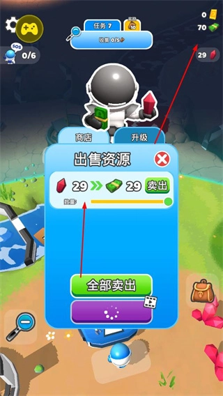 出售收集的资源获取钞票,用于升级、解锁新内容,持续挖掘、升级、交易。