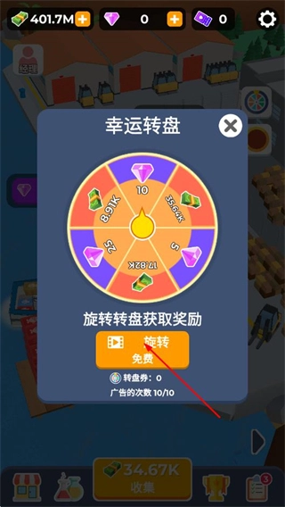找到“幸运转盘”的入口后点击免费旋转,此时需要观看一段广告;待转盘停止转动,若指针指向钻石区域,即可直接获取相应数量的钻石。