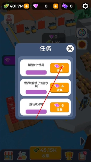 进入游戏内的任务中心,你会发现里面包含解锁新区域、培育特定水坝设施之类的任务,按照要求完成这些任务后,点击“领取奖励”按钮,就可以获取钻石了。