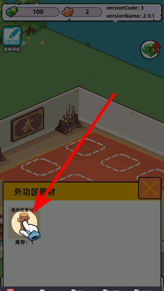 在练功区的器材界面里,挑选标有练功加速字样的木桩,打算把它安置到恰当的地方。