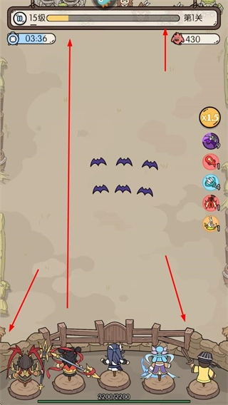 潮水式怪物进攻机制:怪物会以一波接一波的形式从屏幕上方密集出现,随着波次推进,怪物的种类、数量以及强度会逐步提升,以此考验玩家对于英雄技能释放时机的把握以及防御节奏的掌控能力。