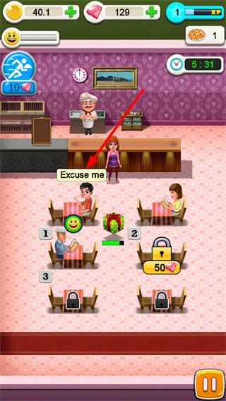 进入游戏后,你会看到餐厅里的陈设,像厨师、餐桌之类的都清晰可见。一旦顾客发出“Excuse me”的提示音,你就点击这位顾客,这样服务员就会过去接待了。