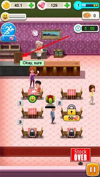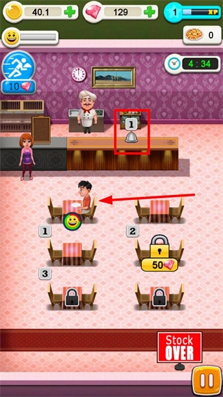 厨师做好菜后,厨房柜台上会有带数字的餐铃提示。点击餐铃就表示菜品已经完成,接着操控服务员去取餐,之后点击对应的顾客餐桌,就能给顾客上菜了。