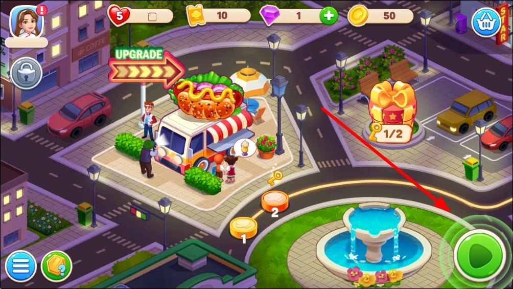 进入游戏主界面后,餐车、金币钻石等信息清晰可见,点击右下方那个绿色的箭头按钮,系统就会自动选择关卡,开启你的烹饪之旅。