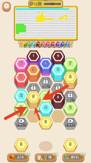 遇到特殊锁定区域时,得先把周边区域填充好,要巧妙运用交换、刷新这类道具来攻克难关,最终达成完美填色的目标。