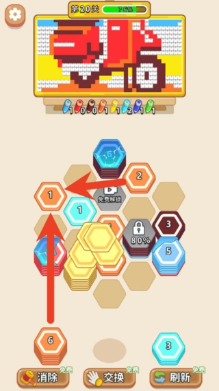 在下方的六边形方块区域里,你可以依据图案的具体需求,挑选带有数字标识的方块(这里的数字表示能够填充的格子数量),建议提前规划一下怎样分配这些数字资源,这样会更高效。