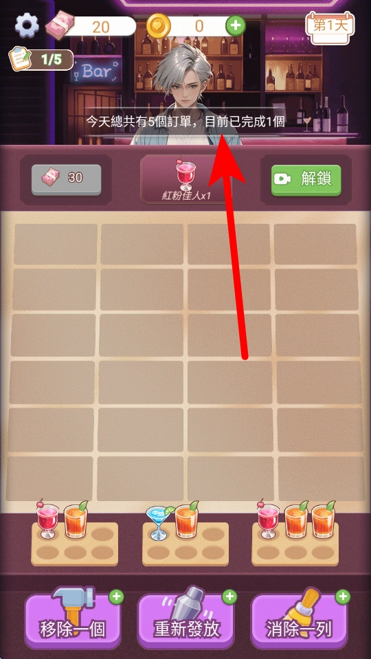 今天酒吧总共接到五个订单,现在已经完成了一个,接下来要留意把包括红粉佳人在内的剩下订单都完成好。