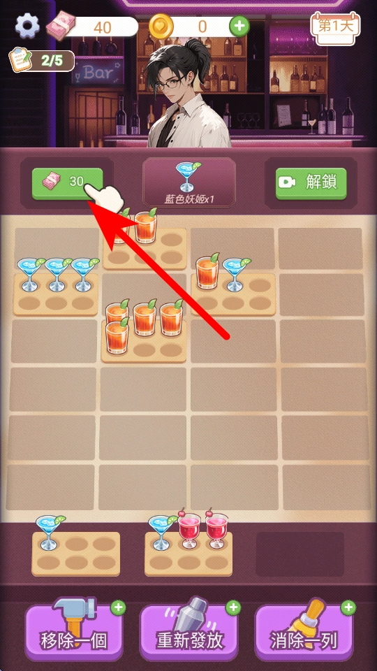 游戏里能把下方的鸡尾酒移到上方格子,通过合理搭配来完成订单,像把对应的鸡尾酒放在一块儿就能满足要求。