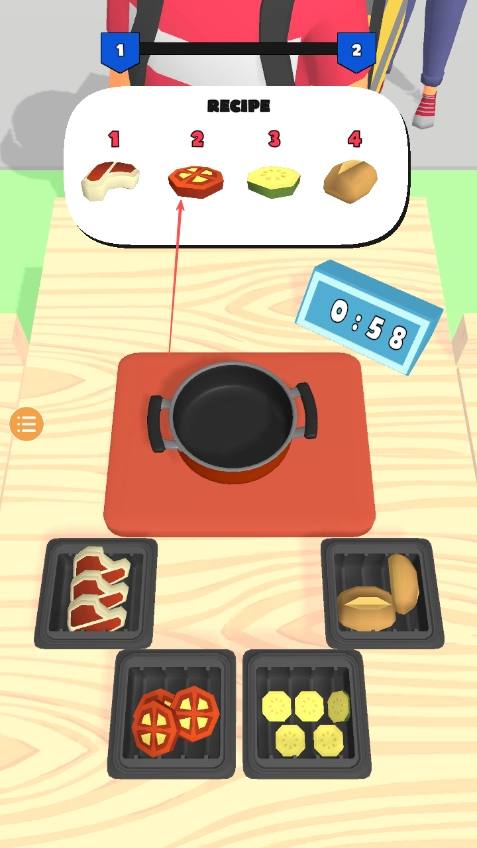 进入游戏界面后,查看顶部的RECIPE食谱,按照顺序把肉、番茄这类食材收集起来放进锅里。