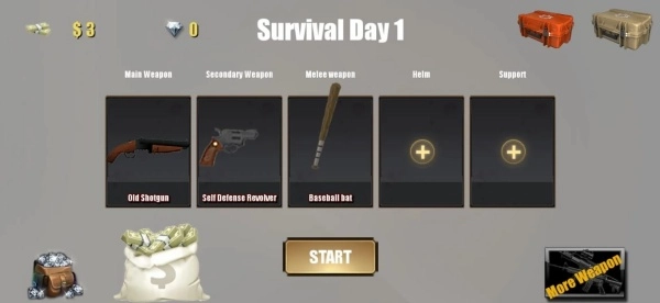 进入游戏后,在初始武器选择界面,你可以依据自己的战斗习惯,来搭配主武器、副武器与近战武器,等搭配完成后,点击“START”就能开启生存挑战。