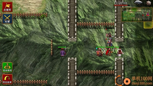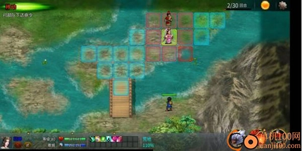 训练2的难度偏高,流程也比较复杂:首先医生向左上方移动一格,给自己施加坚固状态,接着引出两名武道家,随后向右侧撤退——这里需要精确计算敌方武道家5格的移动范围和4格的施法距离,最终能单独拉出其中一名,同时在右侧村庄附近卡住另一名;负责练级的武将则躲在后方释放策略。之后用同样的方法将第二名武道家也拉到相同位置,重复上述操作。解决掉这两名武道家后,队伍再向右上方的城池移动,引出南门的一名步兵;依旧沿用之前的思路,由医生利用山地地形卡住位置,练级武将在后方释放策略。由于步兵的坦度相对较高,且城池内的敌方医生会出来加血,这个点位可以刷到30回合。