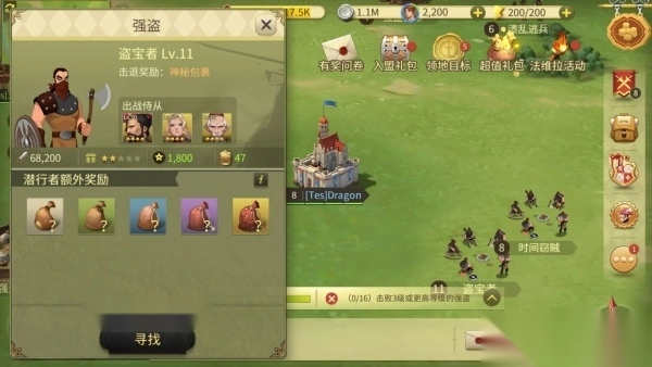玩家除了在地图上直接查找强盗,还能借助搜索功能锁定合适目标。进入搜索界面后,可挑选心仪的强盗或强盗营寨等级,点击搜索按钮,系统便会自动跳转至距离我方城市最近的对应等级强盗目标。