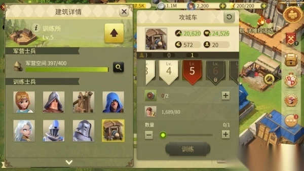 在游戏里能够管理军营,还能展示各式各样的士兵,并且可以对士兵进行训练,以此提高士兵的攻击力。