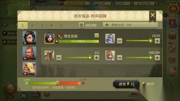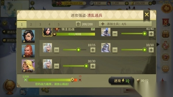 选定目标后,玩家接下来要做的是为进攻做准备。这时候需要搭配好自己的进攻阵容以及侍从组合,尽可能让自己军团的战力超过强盗的战力,准备妥当后就能向强盗发起进攻了。