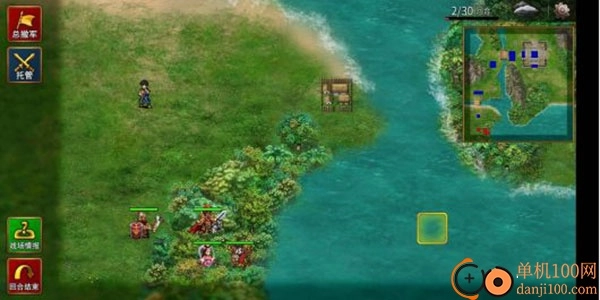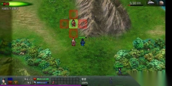 训练2的难度偏高,流程也比较复杂:首先医生向左上方移动一格,给自己施加坚固状态,接着引出两名武道家,随后向右侧撤退——要精准计算敌方武道家5格的移动范围和4格的施法距离,最终能单独拉出其中一名,同时在右侧村庄附近卡住另一名;练级用的武将则躲在后方释放策略。之后用同样的方法把第二名武道家也拉到相同位置,重复上述操作。解决掉这两名武道家后,队伍向右上方的城池推进,引出南门的一名步兵;同样让医生利用山地地形卡住位置,练级武将在后方释放策略。由于步兵相对肉一些,而且城池里的敌方医生会出来加血,这套流程可以反复刷到30回合。