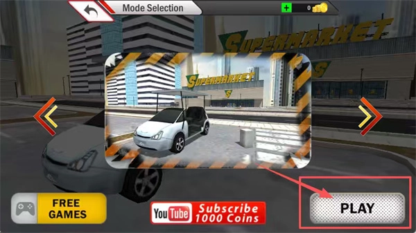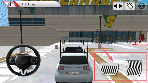 在驾驶操作界面里,你可以通过左下角的方向盘来控制行驶方向,再搭配右下角的油门和刹车踏板,来操控那辆浅蓝色的汽车,进而完成商场停车之类的指定任务。
