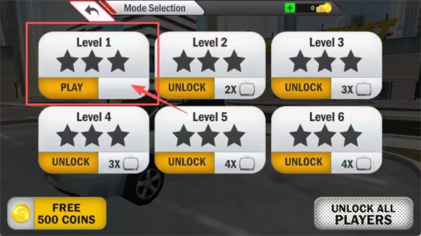 进入关卡选择界面后,点击左上角“Level 1”旁边的黄色“PLAY”按钮即可开启第一关,尚未解锁的关卡需要完成前置要求或通过观看广告来解锁。