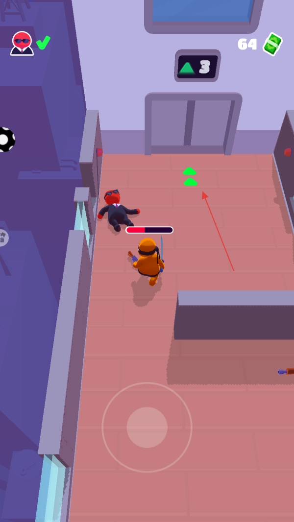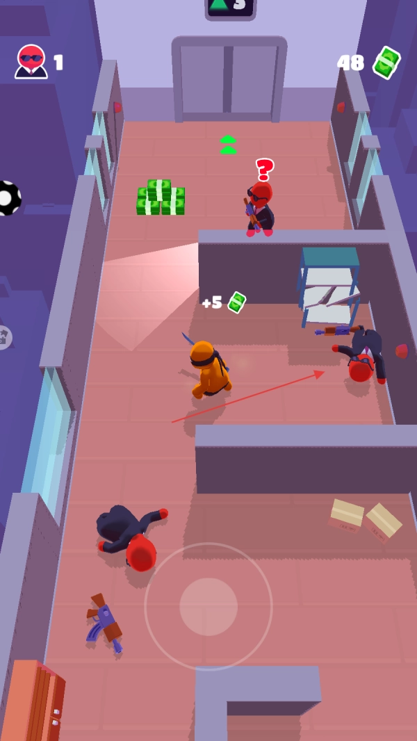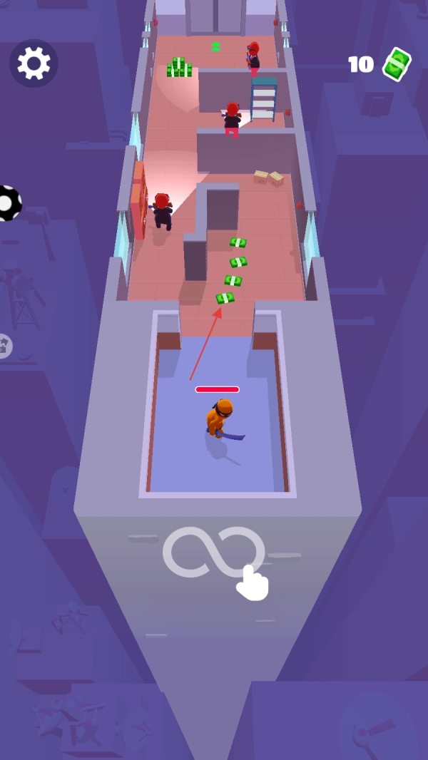 控制橙色角色在场景通道中移动,注意观察周围穿红色衣服的敌人所在位置,利用场景里的障碍物来隐藏自己,逐步接近散落着绿色钞票的区域,为接下来的行动预先做好准备。