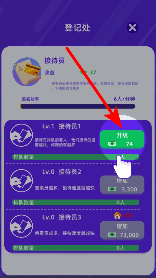 在登记处,建议优先点击升级按钮来提升接待员等级,这样能加快接待速度,进而增加收益。